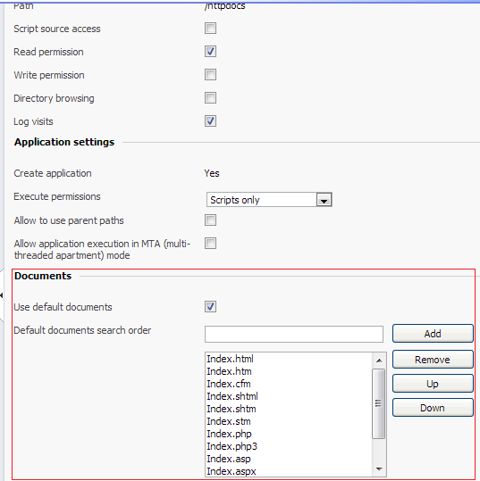 - Under Documents section you are able to change the order of index files of the main web directory. If you want index.aspx instead of index.html, you have to make sure that the index.aspx is listed above index.html. If your preferred file does not exist in the list, then you have to add it manually to the list. Also make sure that the index file that you choose exists in your web directory.
